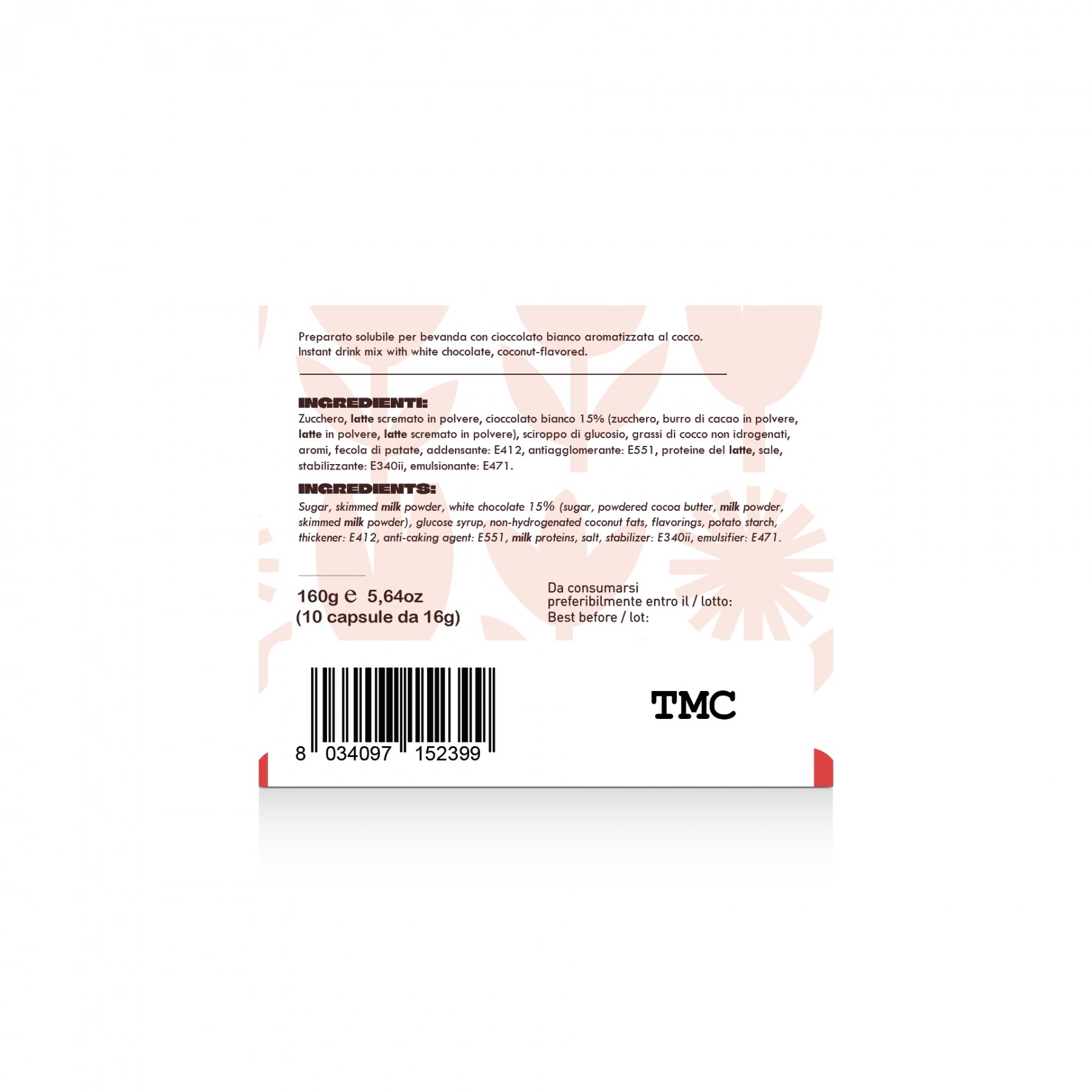 Ingredienti: Zucchero, latte scremato in polvere, cioccolato bianco 15% (zucchero, burro di cacao in polvere, latte in polvere, latte scremato in polvere), sciroppo di glucosio, grassi di cocco non idrogenati, fecola di patate, addensante: E412, aromi, antiagglomerante: E551, proteine del latte, sale , stabilizzante: E340ii, emulsionante: E471.