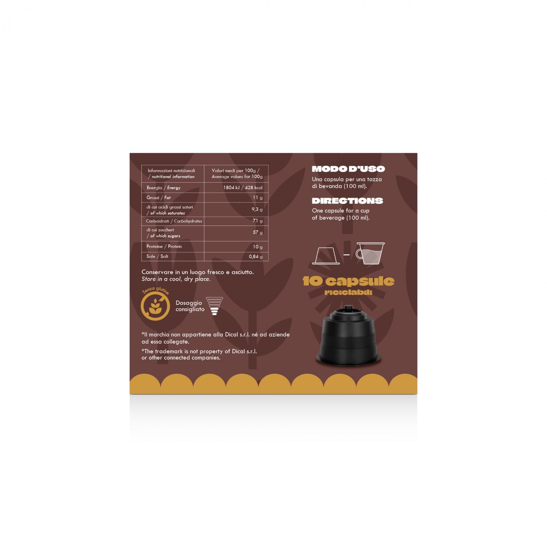 * I marchi Nescafè®️ , Dolce Gusto®️ contrassegnati dall’asterisco sono marchi registrati appartenenti ai rispettivi registranti. I marchi sopra indicati non appartengono a Dical s.r.l. nè ad aziende ad essa collegate. La compatibilità delle capsule prodotte da Dical s.r.l. è funzionale all’utilizzo con le relative macchine da caffè ad uso domestico - Ulteriori informazioni