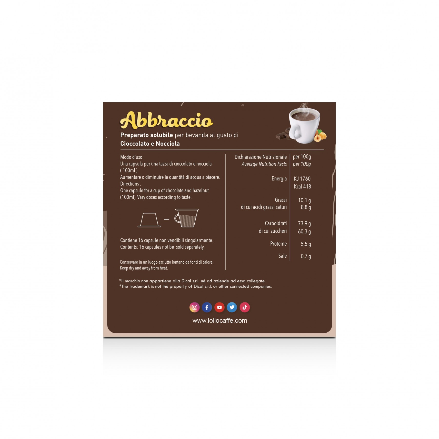 Un preparato solubile al gusto cioccolato e nocciola, Lollo Caffè Cioccolato e Nocciola è ideale come alternativa al caffè per godersi un momento di piacere e golosa energia.